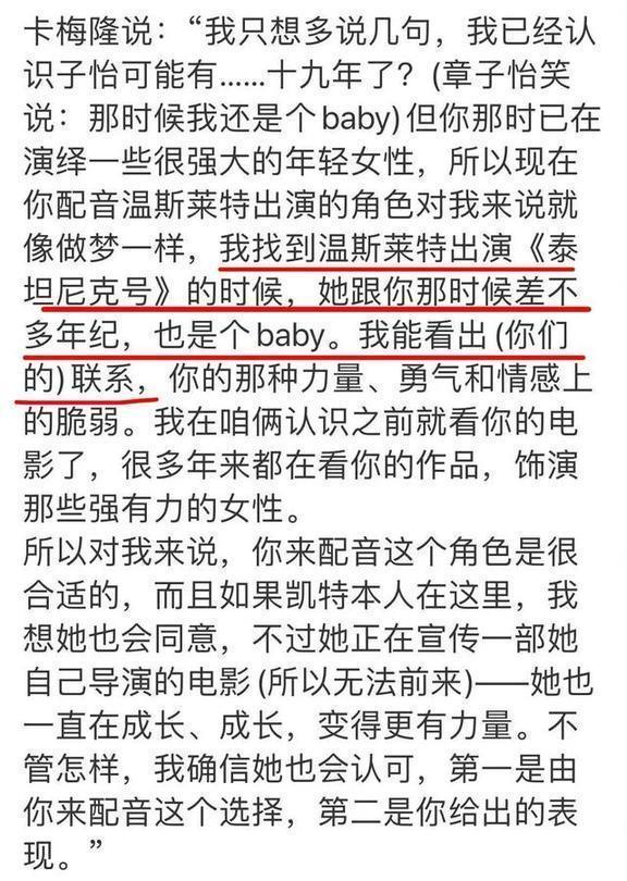 卡梅隆也很赞赏章子怡,觉得她跟《泰坦尼克号》里的露丝(凯特·温斯莱特饰)特别像,都是那种强势的女性。