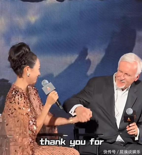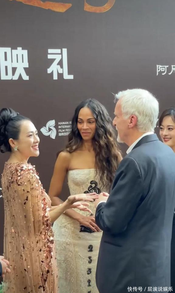 章子怡一开场就是活灵活现的人情世故课。专门感谢导演让中国演员有机会再参与阿凡达系列。她说的是中文,担心卡梅隆听不明白她的感谢,赶紧换成英语,把刚才的话流利地说了一遍。说完,导演也很有面子地握了握手。